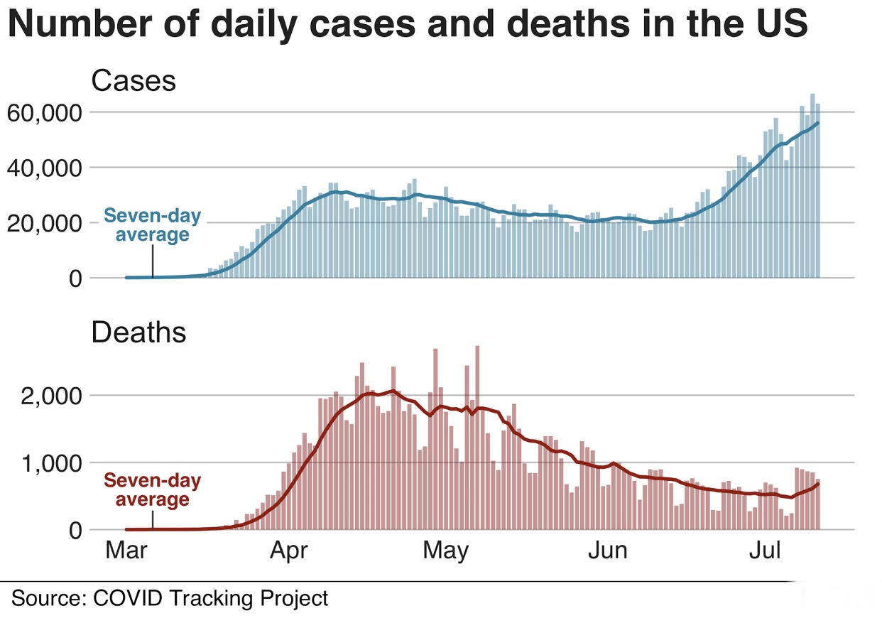 The United States overall has been exceeding new daily totals of 60,000 cases for the past few days. Other states including Arizona, California and Texas continue to see a rising cases.