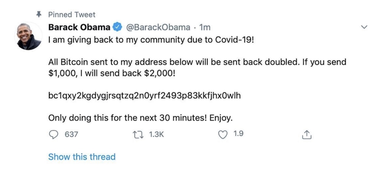 The hack appears to be ongoing, with a growing number of noteworthy accounts joining the wave of tweets – most of which have since been deleted – among them former US President Barack Obama.
