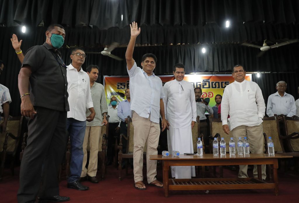 Sri Lanka’s main opposition candidate Sajith Premadasa, center, waves to supporters during a meeting in Colombo, Sri Lanka, July 31, 2020. Sajith Premadasa is the son of former President Ranasinghe Premadasa who was killed in a suicide bombing by separatist rebels in 1993. Premadasa leads a political party that broke away from the United National Party, the country’s largest party. (AP Photo/Eranga Jayawardena)
