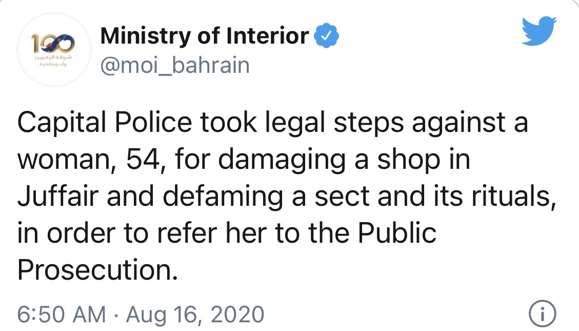 “The Capital Police took legal steps against a woman, 54, for damaging a shop in Juffair and defaming a sect and its rituals, in order to refer her to the Public Prosecution,” the police said on its Twitter account.