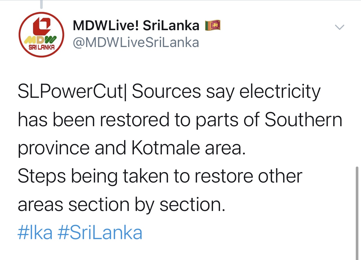 Electricity has been restored to some parts of the southern province and Kotmale area at about 4.50pm local time.