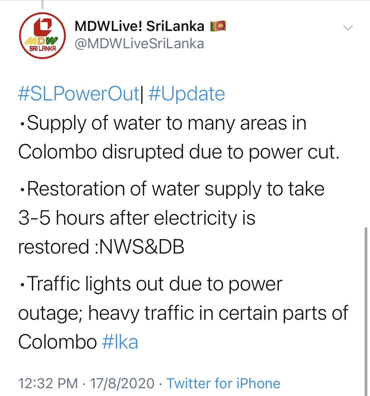 The power cut has also affected the water supply to several areas in Colombo which could only be restored after 3-5 hours after electricity is restored.
