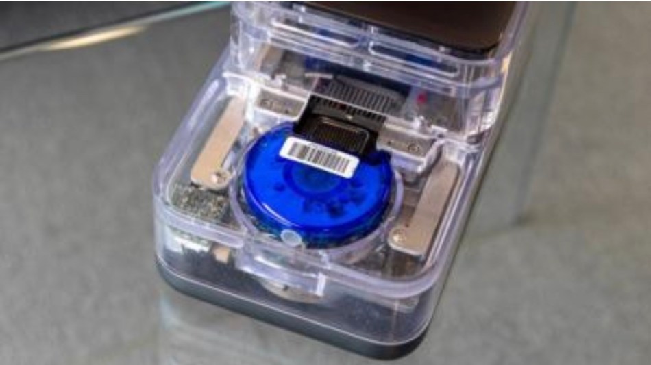 This in turn is slotted into a shoebox-sized machine to perform the analysis.