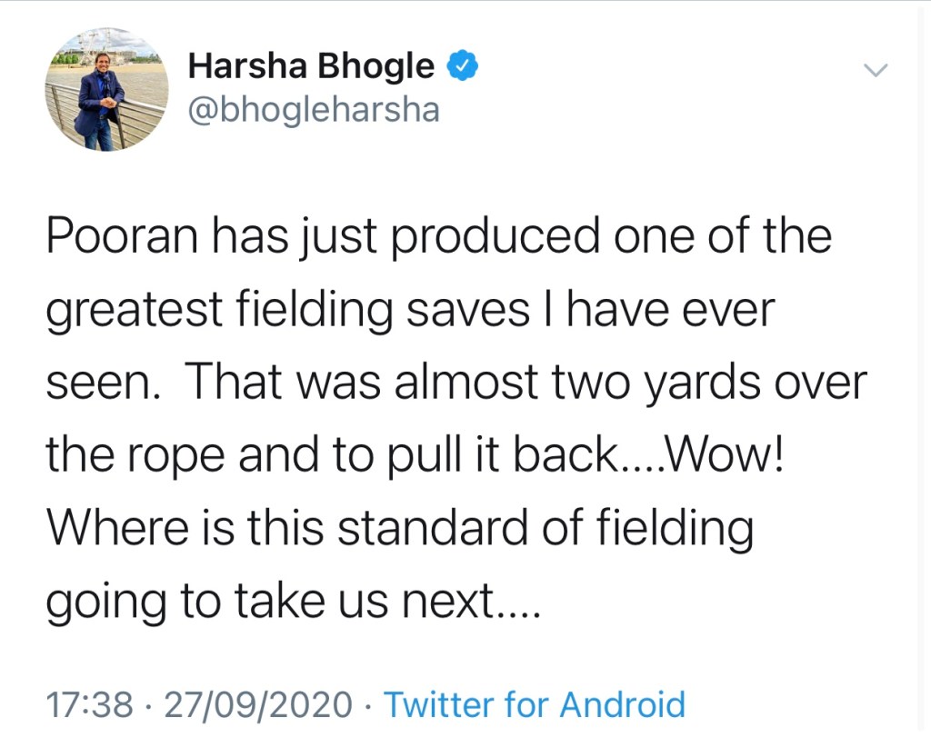 “Pooran has just produced one of the greatest fielding saves I have ever seen. That was almost two yards over the rope and to pull it back….Wow! Where is this standard of fielding going to take us next….,” wrote Harsha Bhogle on Twitter.