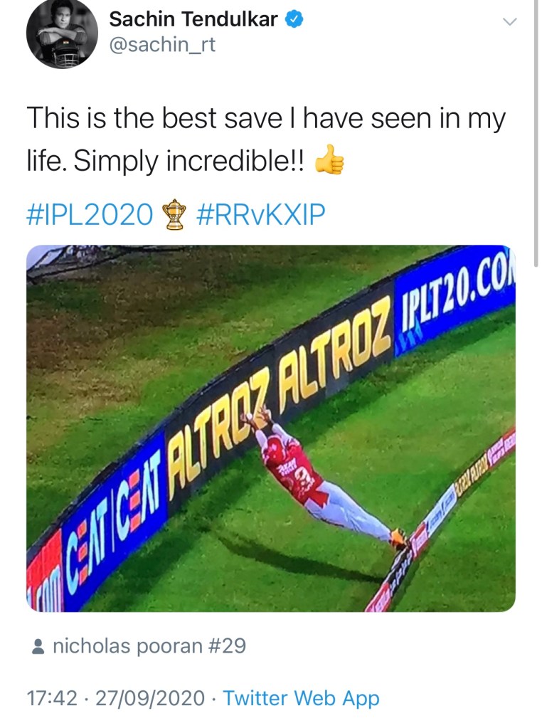 Nicholas Pooran produced a stunning save in the out-field for Kings XI Punjab versus Rajasthan Royals in the Indian Premier League (IPL) 2020 encounter in Sharjah on Sunday. Pooran’s audacious feat received high praise for his fielding, with legend Sachin Tendulkar calling it “the best save I have seen in my life”.