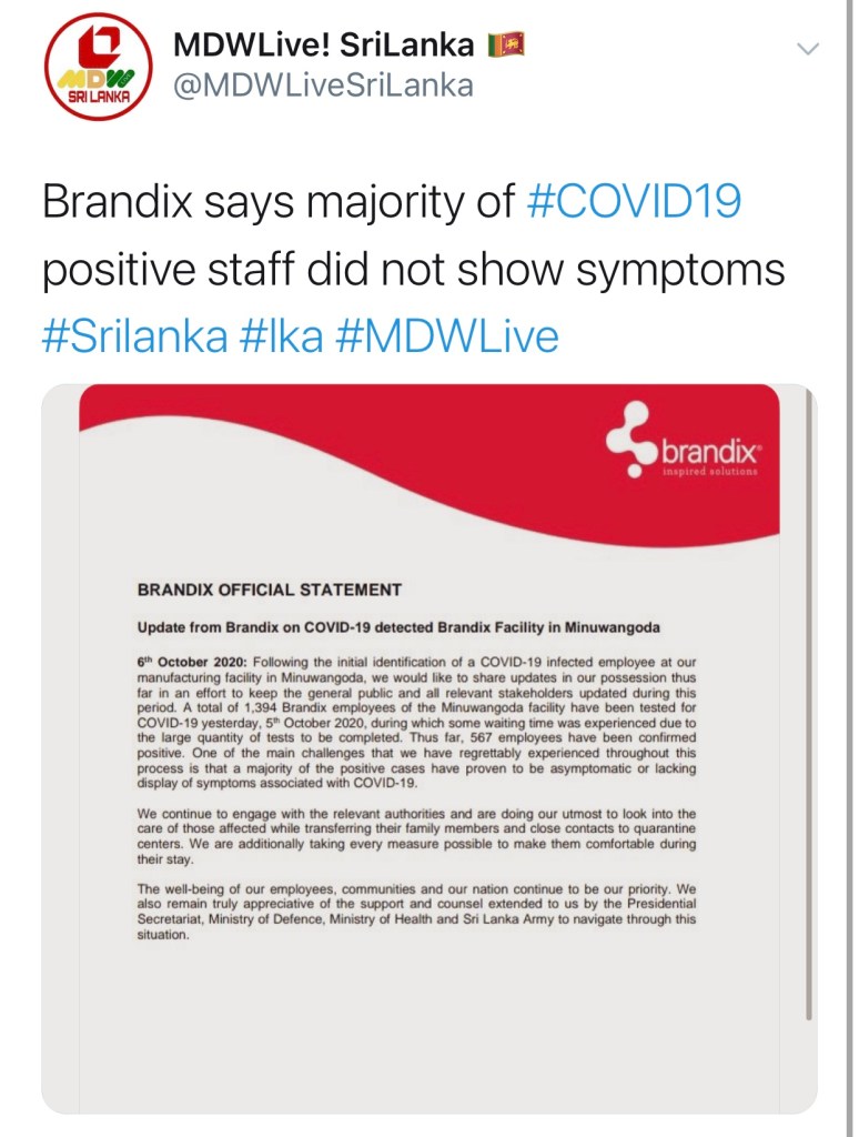 Brandix says it continues to engage with the relevant authorities and are doing their utmost to look into the care of those affected while transferring their family members and close contacts to quarantine centers.