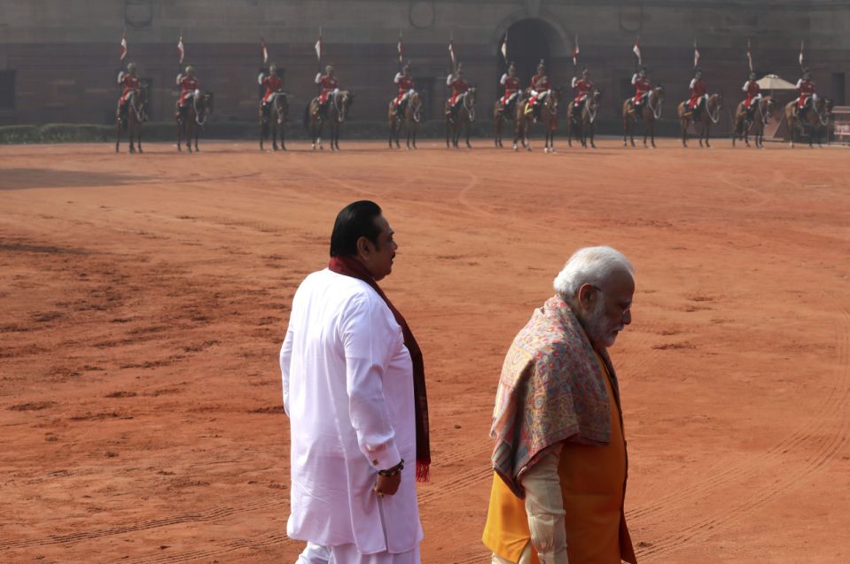 FILE – In this Feb. 8, 2020, file photo, Indian Prime Minister Narender Modi, right, leaves for his position as his Sri Lankan counterpart Mahinda Rajapaksa walks to inspect a joint military guard of honor, during his ceremonial reception at the Indian presidential palace, in New Delhi, India. Sri Lankan Provincial Councils Minister Sarath Weerasekara said Thursday that India has no moral right to interfere with the country’s internal affairs by insisting on power sharing with minority Tamils, because the regional power failed to fulfil its obligations under a 1987 agreement to disarm separatist rebels and to ensure a non-return to hostilities. Weerasekara’s speech in Parliament is seen as the island nation’s response to Modi who in a telephone conversation with Rajapaksa last month asked for a full implementation of constitutional provisions that provide for power sharing with Tamil minority regions. (AP Photo/Manish Swarup, File)