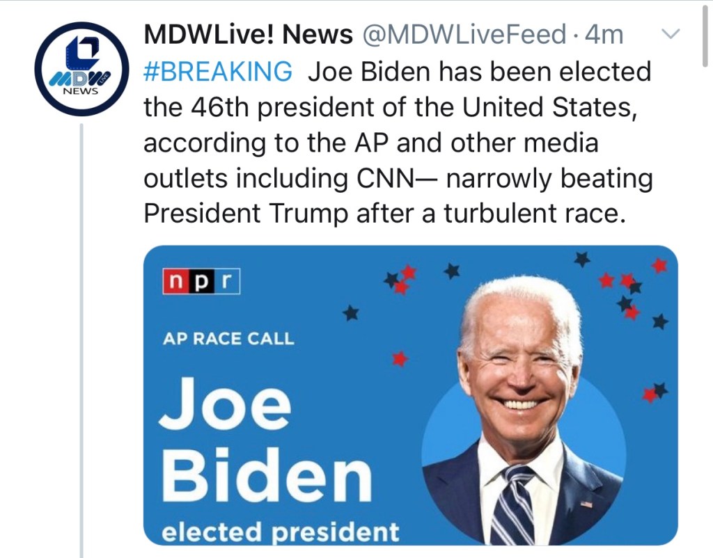The projections that Mr Biden has won the key battleground of Pennsylvania, propelling him over the 270 electoral college vote threshold required to clinch the White House.