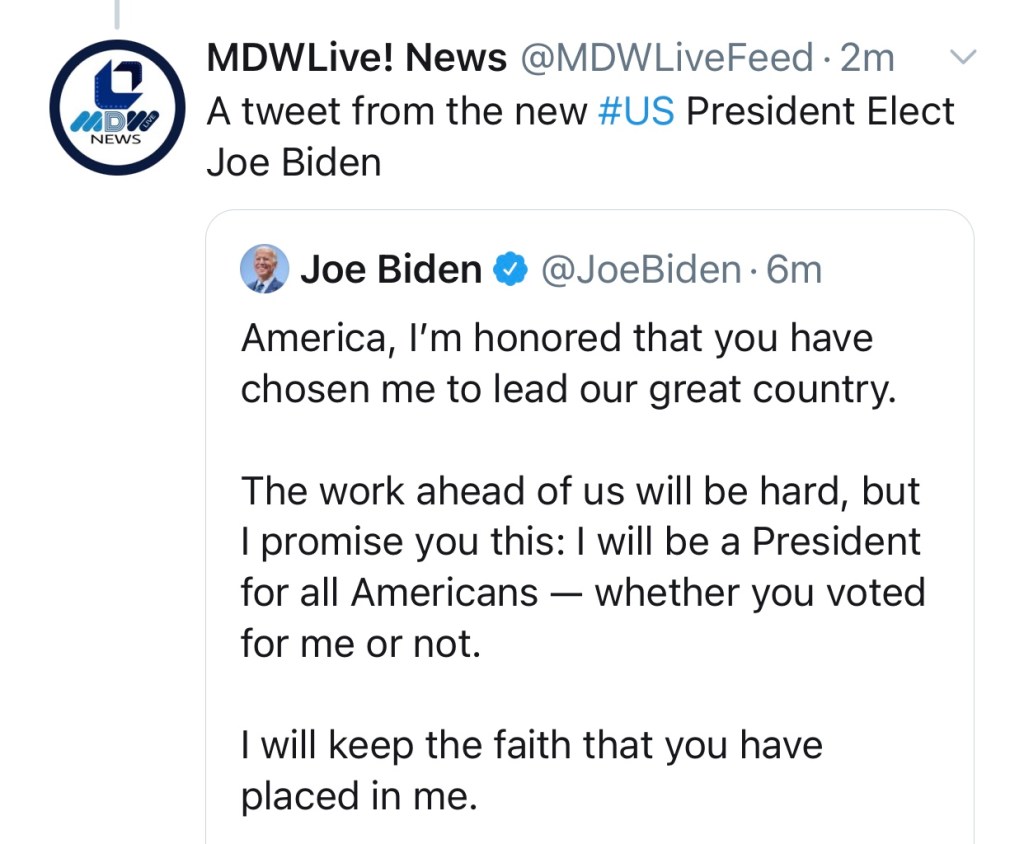 Mr Biden’s victory is based on the unofficial results from states that have already finished counting their votes, and the expected results from states like Wisconsin where the count is continuing.