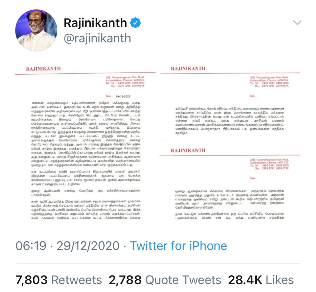His announcement comes after Rajinikanth was hospitalised on Christmas Day in Hyderabad after suffering from severe hypertension and exhaustion.