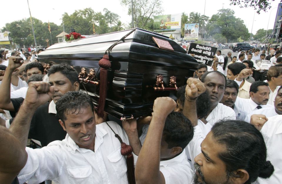 FILE – In this Monday, Jan. 12, 2009, file photo, Sri Lankans shout slogans against the government during the funeral procession of the Sunday Leader newspaper editor Lasantha Wickrematunge, in Colombo, Sri Lanka. The daughter of the slain journalist filed a complaint Friday, Jan. 8, 2021, with the United Nations Human Rights Committee over alleged government involvement in her father’s death 12 years ago. The San Francisco-based Center for Justice and Accountability filed the complaint on behalf of Ahimsa Wickrematunge, the daughter of Lasantha, who was allegedly killed by a military-linked hit squad while driving to work on Jan. 8, 2009. (AP Photo/Gemunu Amarasinghe, File)