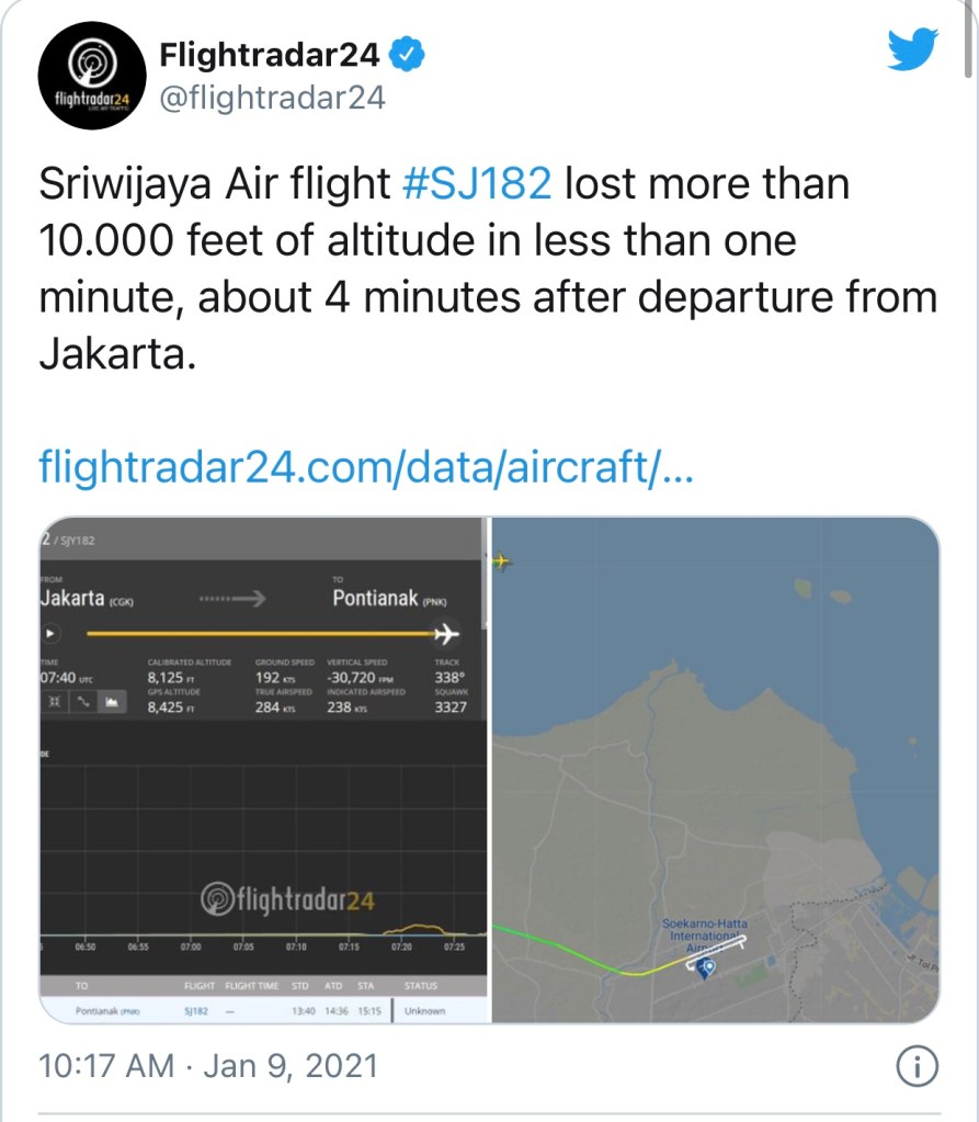 Flight SJ182 disappeared from radars shortly after takeoff. The Boeing 737 plane lost more than 10,000 feet of altitude in less than a minute, reported flight tracker website FlightRadar24.