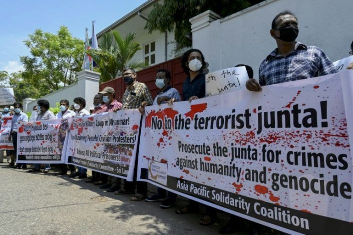Activists protest outside Myanmar’s embassy in Colombo to denounce the military coup that toppled civilian leader Aung San Suu Kyi