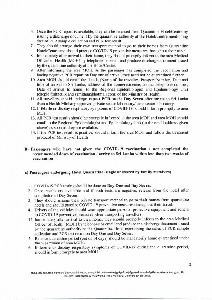 The Health Ministry said both Sri Lankans and Foreign Nationals arriving in Sri Lanka two weeks after completing the recommended doses of the COVID-19 vaccination should undergo PCR tests within 24 hours of arrival from a Health Ministry approved private-sector laboratory / state-sector laboratory.