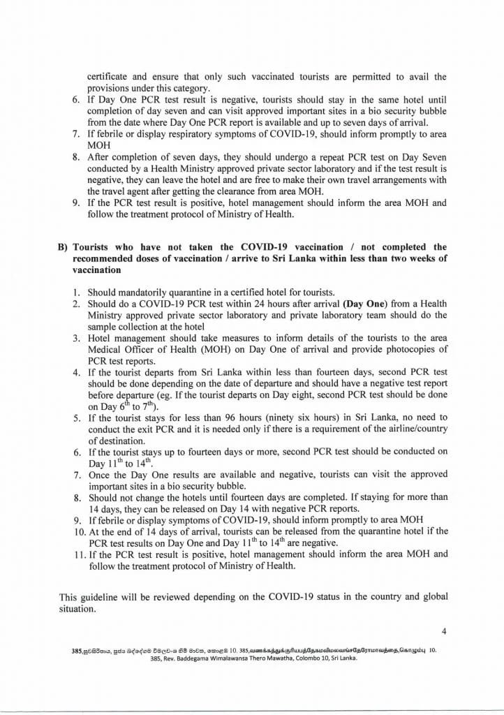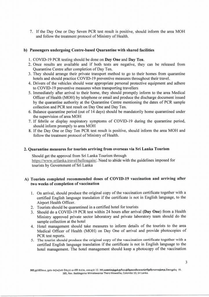 Passengers arriving in Sri Lanka without receiving the COVID-19 vaccine will undergo quarantine for a period 07 days and must also undergo PCR tests on Day ONE and Day SEVEN.