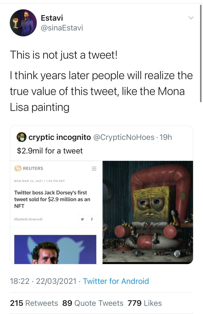 Cent confirmed the buyer is Sina Estavi. Estavi’s Twitter profile, @sinaEstavi, says he is based in Malaysia and is CEO of the blockchain company Bridge Oracle. Estavi told Reuters he was “thankful” when asked for comment about the purchase.