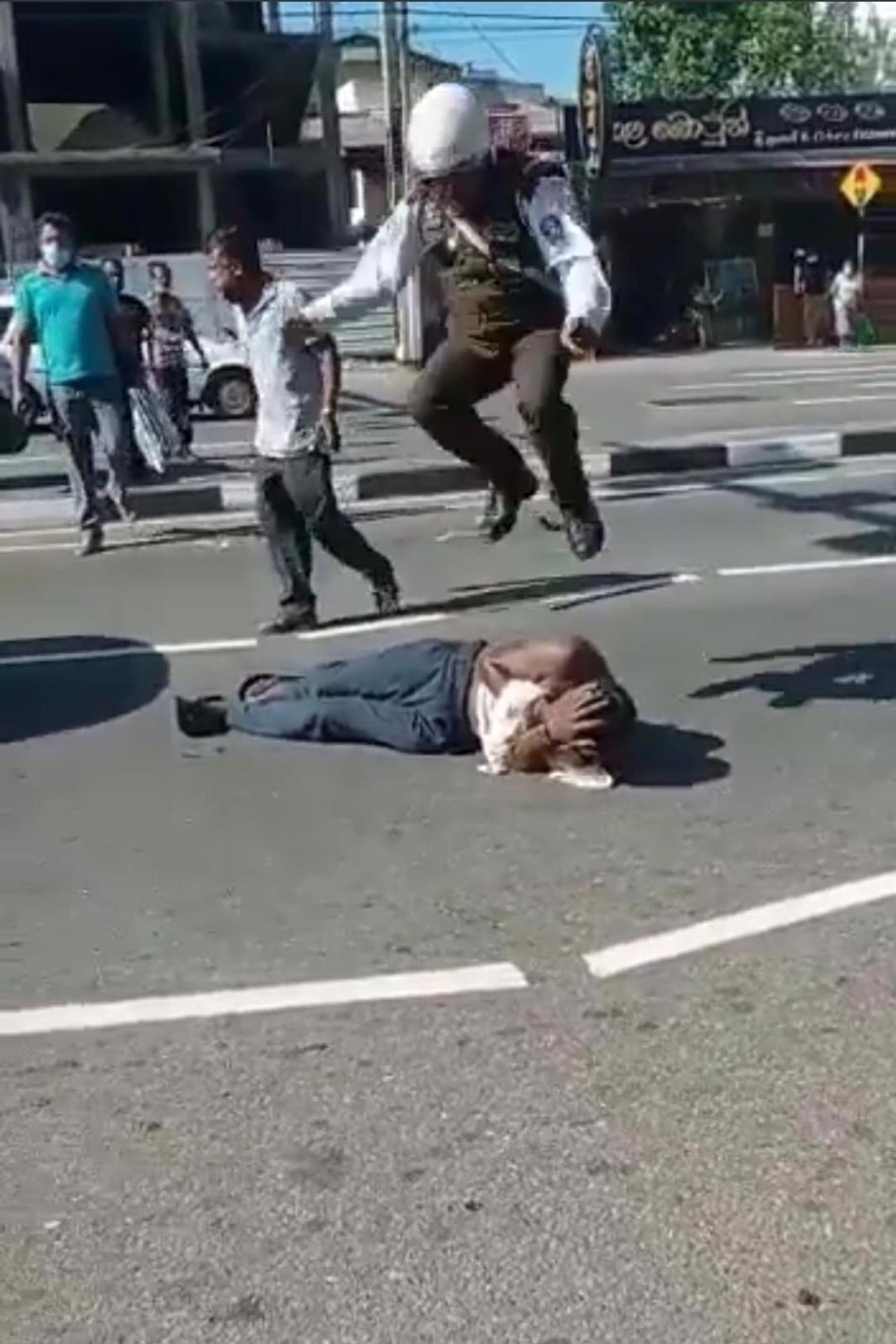 A Traffic Policeman jumping on to man beaten to ground has gone viral on social media in Sri Lanka. Details of the incident is still unknown.