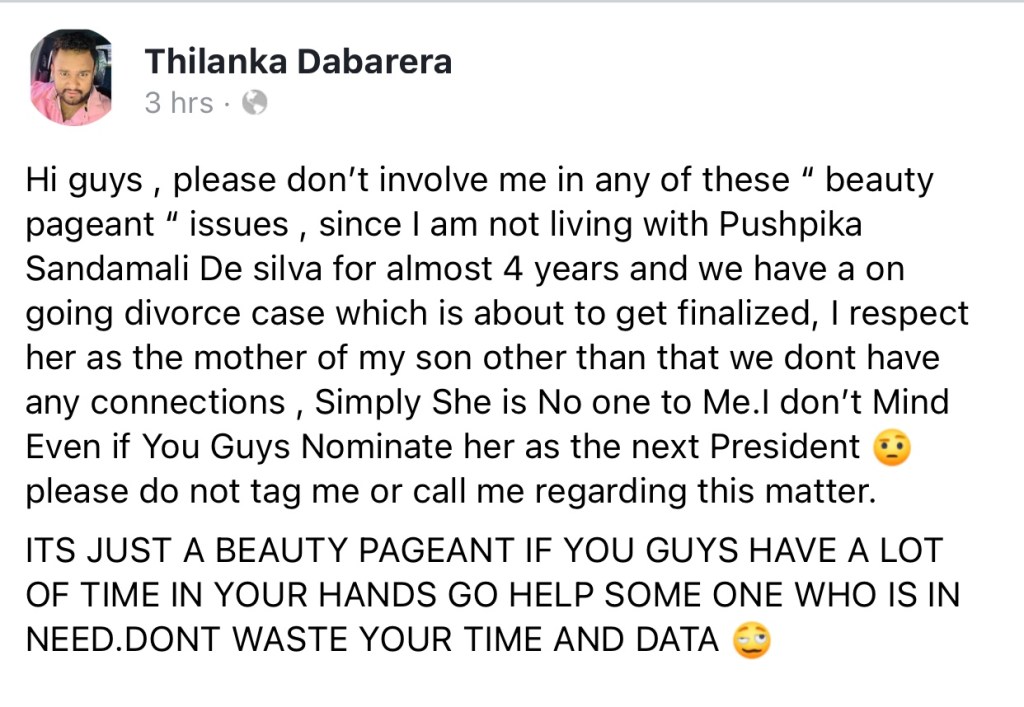In a Facebook post Dabarera requests public not to drag him into the controversy over Mrs Sri Lanka 2021 pagent where his son’s mother was uncrowned in a shocking manner last night by Mrs World, Caroline Juri.