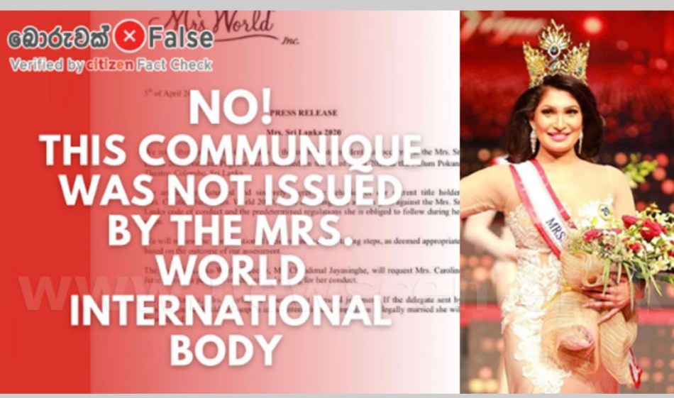 According to Citizen Fact Check the widely circulated press release by Mrs World Inc in Sri Lankan media is fake.