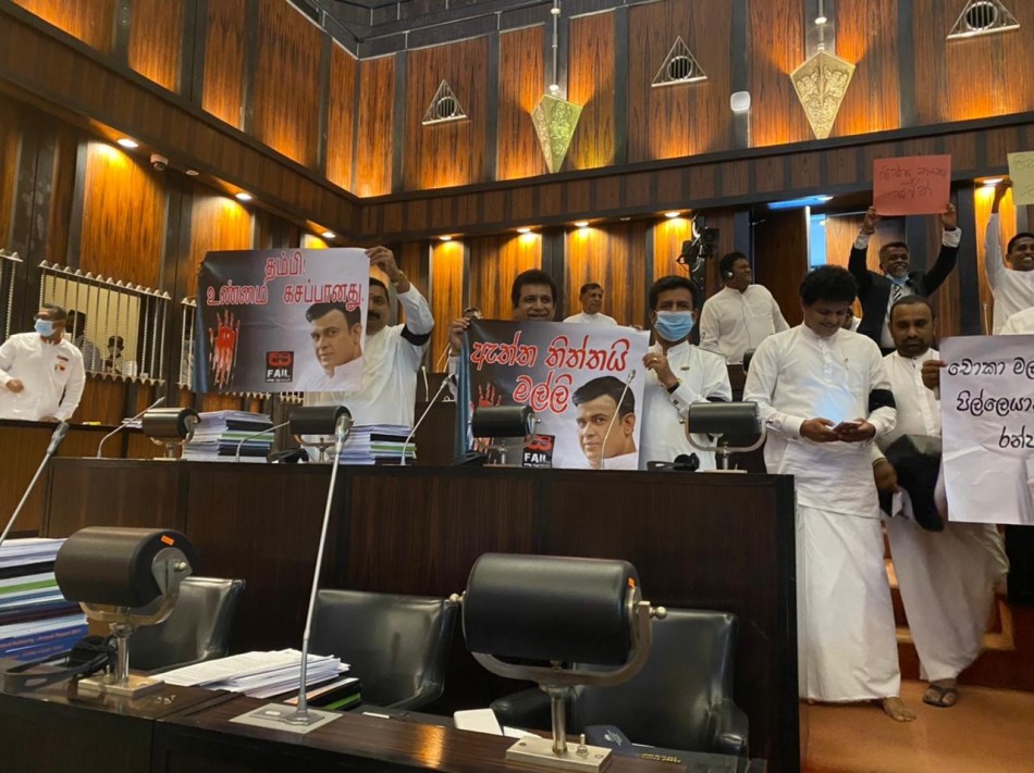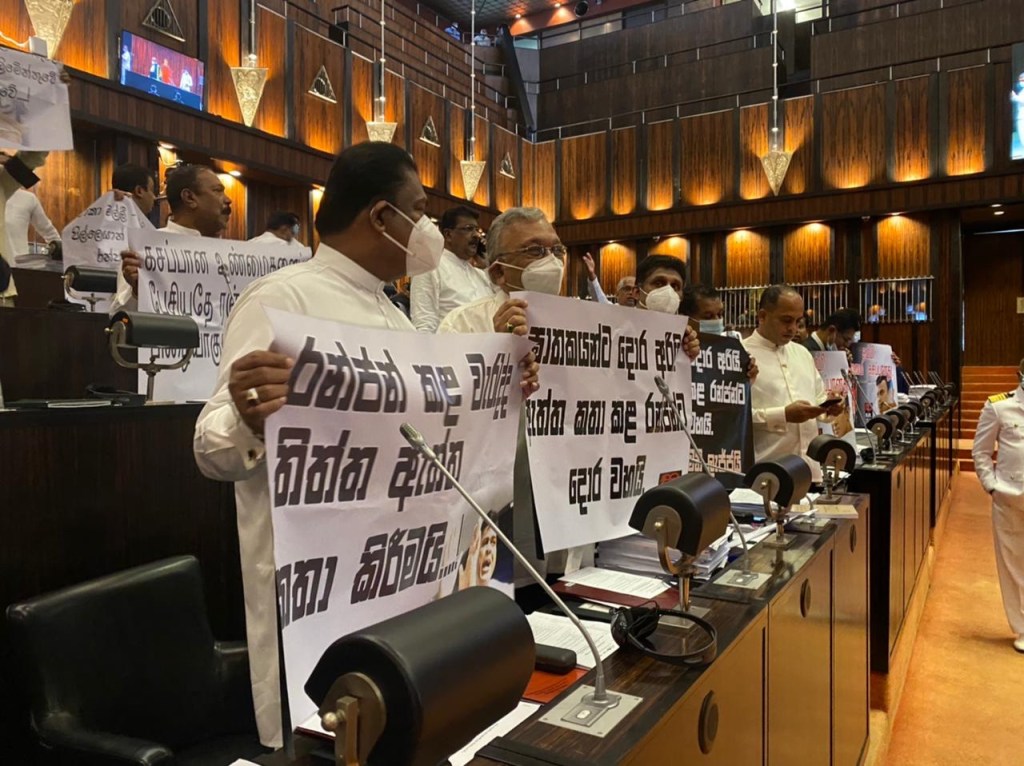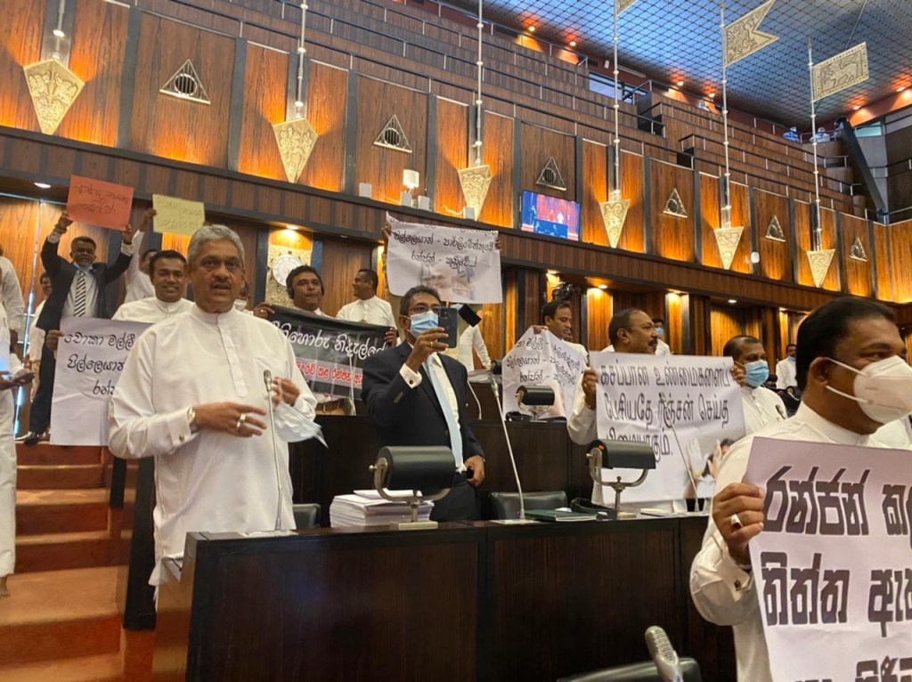Lawmakers protested again today with banners and slogans and black arm bands regarding the seat of Samagi Jana Balawegaya (SJB) Gampaha District MP Ranjan Ramanayake vacant seat, three months after he was sentenced by the Supreme Court (SC) to four years rigorous imprisonment for contempt of court.