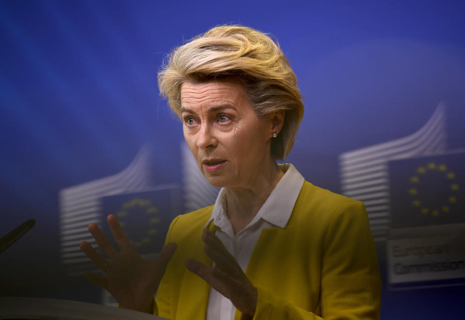 European Commission President Ursula von der Leyen delivers a statement after a meeting of the college of commissioners at EU headquarters in Brussels, Wednesday, April 14, 2021. EU Commission chief Ursula von der Leyen announced plans Wednesday for a major contract extension for COVID-19 vaccines with Pfizer stretching to 2023. (John Thys, Pool via AP)