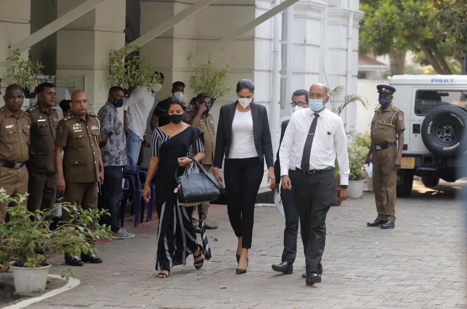 Mrs. World 2019 Caroline Jurie, center, leaves a police station after obtaining bail in Colombo, Sri Lanka, Thursday, April 8, 2021. Jurie’s decision to remove the crown from the the winning Mrs. Sri Lanka contestant on stage moments after the winner was announced, because of claims she was a divorcee, drew widespread social media condemnation. The winner Pushpika de Silva who was crowned again later had complained to police that her head was wounded when the clips of her crown were removed by Jurie. (AP Photo/Eranga Jayawardena)