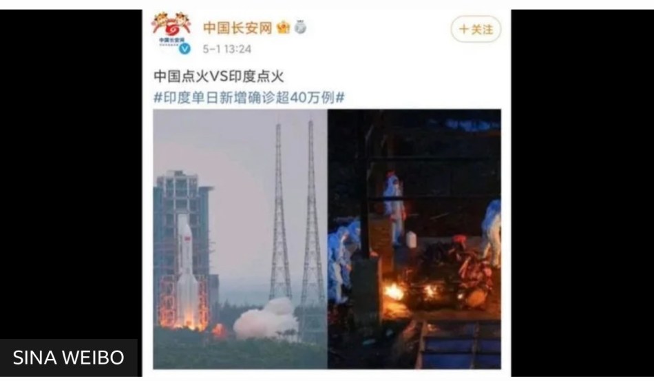 Photos of the Tianhe module launch and its fuel burn-off were compared with what appeared to be a mass outdoor cremation in India, and captioned “China lighting a fire versus India lighting a fire.” The post on Saturday by the Communist Party’s Central Political and Legal Affairs Commission on its official Sina Weibo account was accompanied by a hashtag noting that new COVID-19 cases in India had surpassed 400,000 a day.
