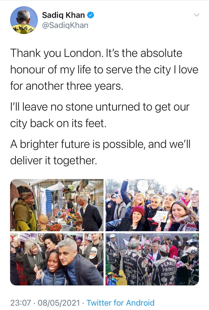 Khan clinched a second term at City Hall after winning 45% to challenger Shaun Bailey’s 35%.