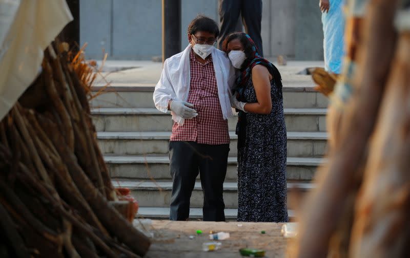 A couple mourns as they stand next to the funeral pyre of a relative who died due to the coronavirus disease (COVID-19), at a crematorium in New Delhi
