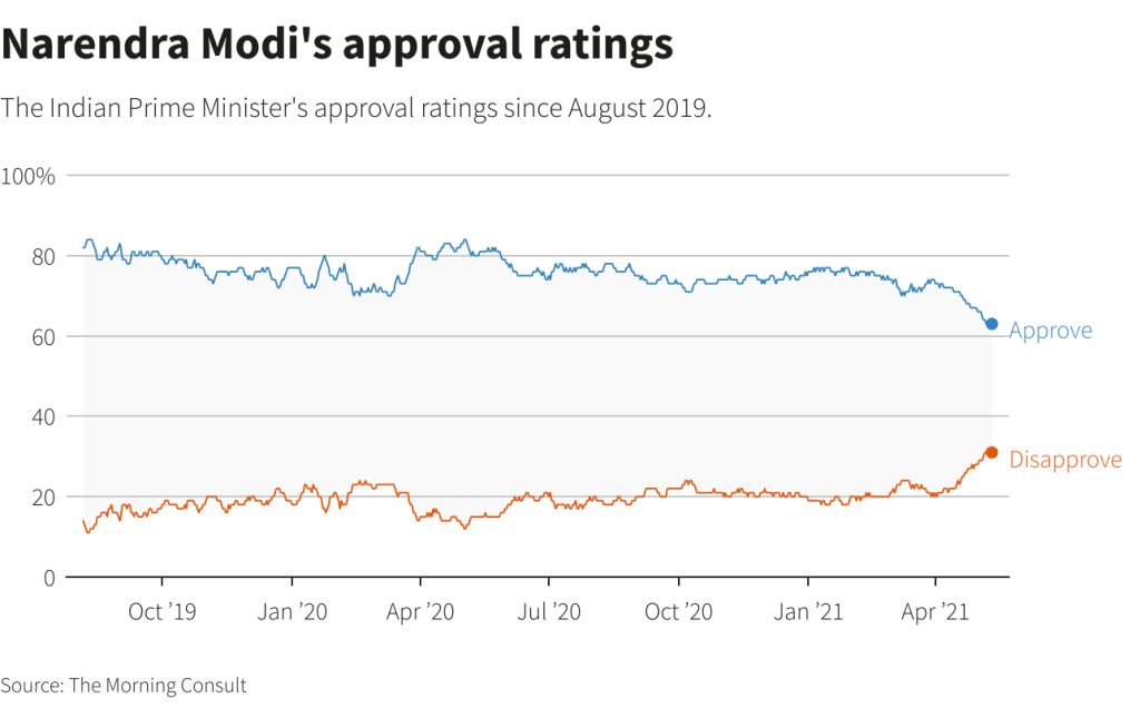 The sharp fall in popularity comes as the pandemic appeared to be overwhelming large urban centres such as Delhi, where hospitals ran out of beds and life-saving oxygen. Bodies piled up in morgues and crematoriums and anger grew on social media over the suffering and perceived lack of government support.