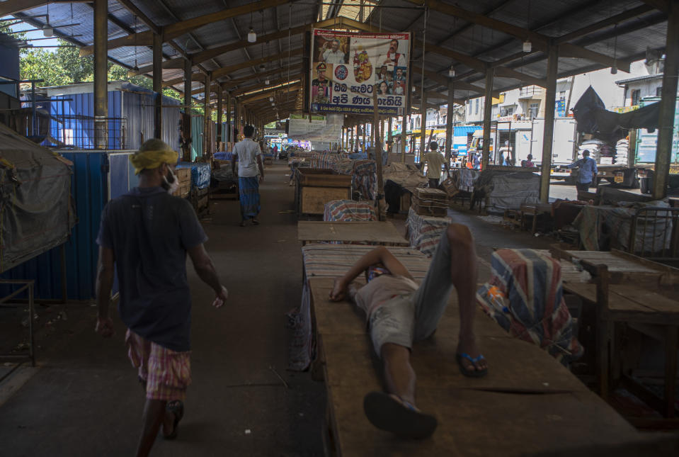 Workers rest at a wholesale market closed to curb the spread of the coronavirus in Colombo, Sri Lanka on June 16, 2021. Sri Lanka has cut back on imports of farm chemicals, cars and even its staple spice turmeric as its foreign exchange reserves dwindle, hindering its ability to repay a mountain of debt as the South Asian island nation struggles to recover from the pandemic. (AP Photo/Eranga Jayawardena)