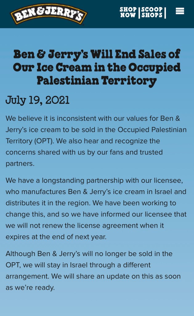 Ben & Jerry’s made its announcement in what has been called one of the strongest and highest-profile rebukes by a well-known company of Israel’s policy of settling its citizens on war-won lands.