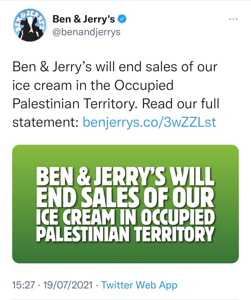 However, major Israeli supermarket chains, the primary distribution channel for Ben & Jerry’s, all operate in the settlements.