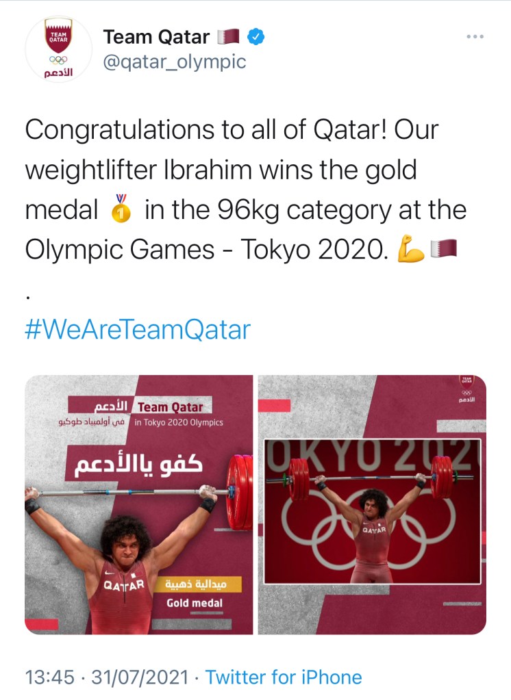 “Our weightlifter Ibrahim has won the Gold medal and an Olympic record! in the 96kg category at the Olympic Games – Tokyo 2020,” Qatar Olympic Committee (QOC) said in a tweet on Saturday.