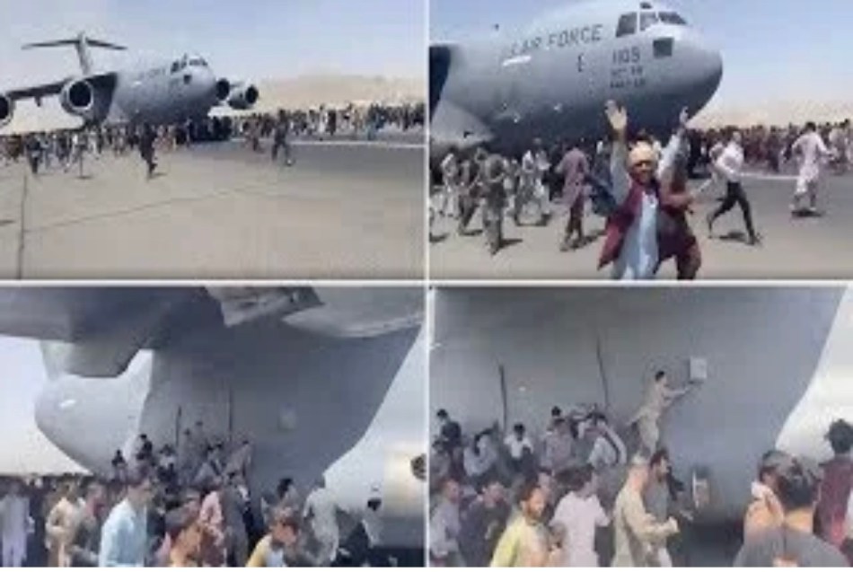 Footage shared on social media appears to show Afghan civilians clinging to the side of a US military aircraft as it prepares to take off from Kabul’s international airport. In the videos, which the BBC has not verified, a number of people are seen apparently sitting on the side of the US military transport plane as it moves down the runway, while crowds run alongside.