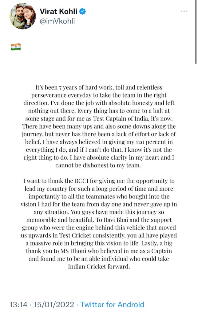 “There have been many ups and also some downs along the journey, but never has there been a lack of effort or lack of belief. I have always believed in giving my 120 percent in everything I do, and if I can’t do that, I know it’s not the right thing to do. I have absolute clarity in my heart and I cannot be dishonest to mv team. I want to thank the BCCI for giving me the opportunity to lead my country for such a long period of time and more importantly to all the teammates who bought into the vision I had for the team from day one and never gave up in any situation. You guys have made this journey so memorable and beautiful. To Ravi Bhai and the support group who were the engine behind this vehicle that moved us upwards in Test Cricket consistently, you all have played a massive role in bringing this vision to life. Lastly, a big thank vou to MS Dhoni who believed in me as a Captain and found me to be an able individual who could take Indian Cricket forward.”