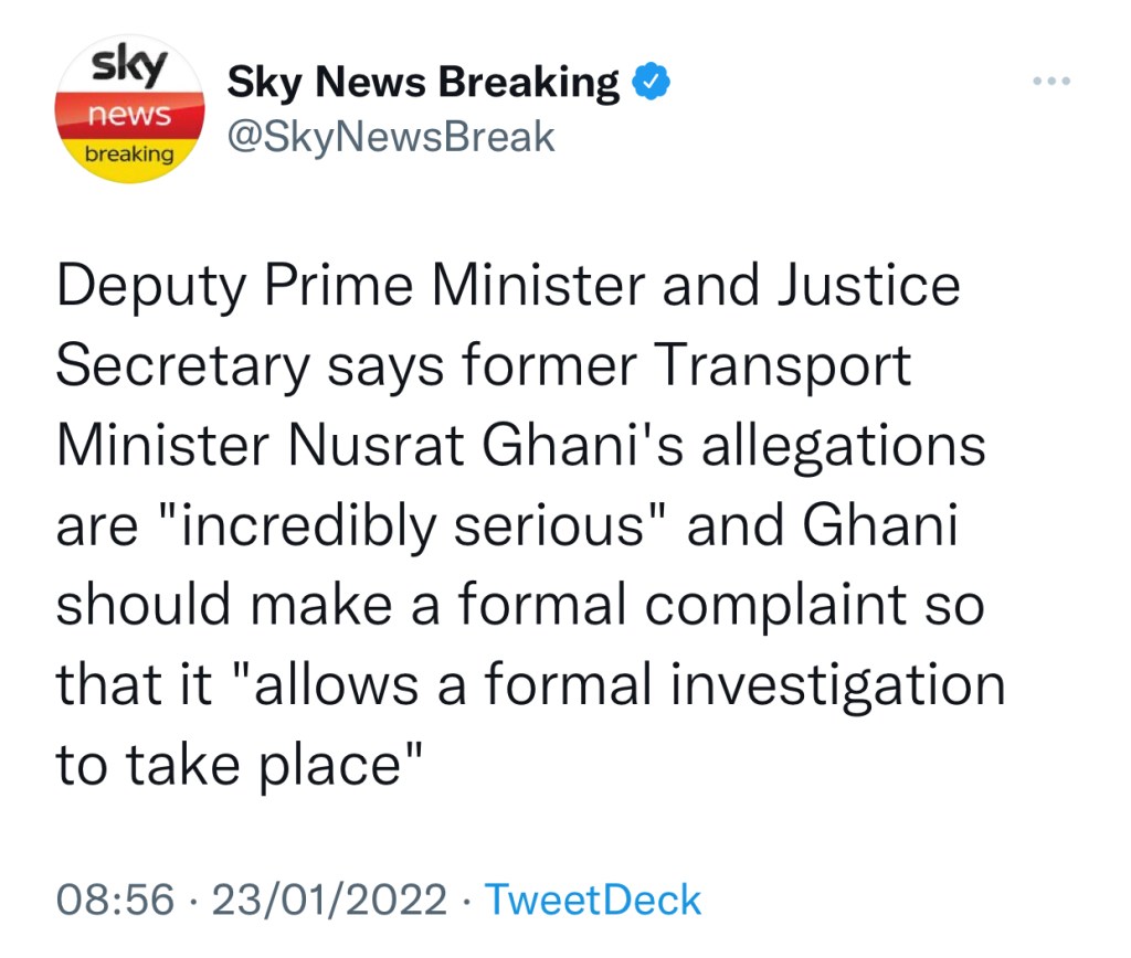 Meanwhile Deputy Prime Minister and Justice Secretary on Sunday says former Transport Minister Nusrat Ghani’s allegations are “incredibly serious” and Ghani should make a formal complaint so that it “allows a formal investigation to take place”.