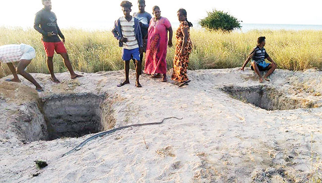 In this photograph taken on March 2, 2021 local residents stand next to graves dug by the authorities to bury Covid-19 coronavirus victims after the government announced reversing its policy of forced cremations of Covid-19 coronavirus victims, at the islet of Iranaitivu off Sri Lanka’s northern province. AFP