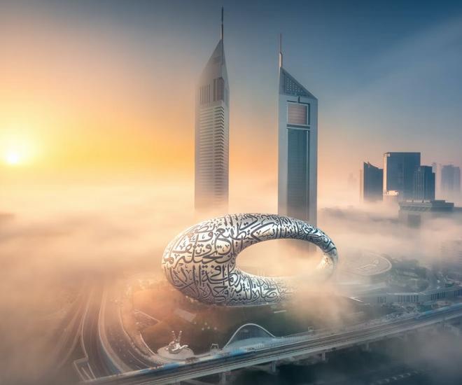 Located in Dubai’s Financial District, the structure is just a short walk from the world’s tallest building, the Burj Khalifa skyscraper. The seven-story building is 77 meters tall and covers an area of 30,548 square metres. The whole area is symbolic. The building’s unique oval shape represents humanity; the green mound below represents the earth; the void represents the unknown future.