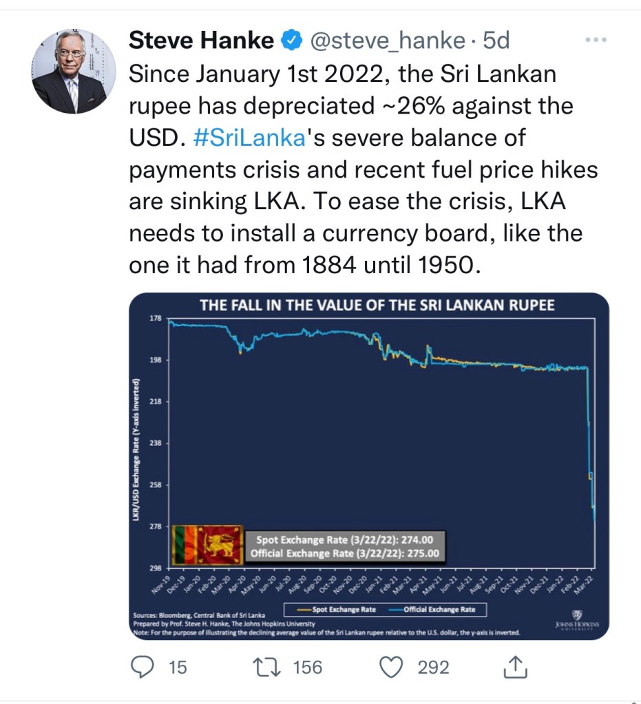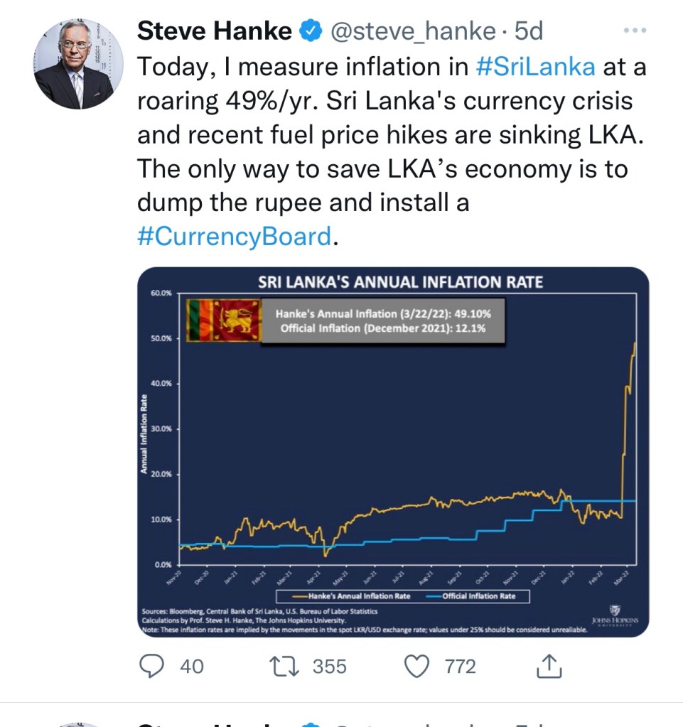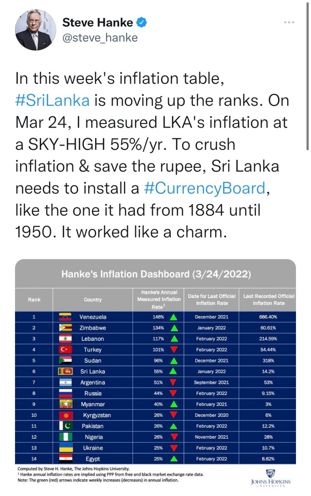 Sri Lanka now moved up to 6th place in the Hanke’s inflation table, measuring 55% pa as per data on 24th March 2022. The top economist reiterated that ‘the only way to save Sri Lanka’s crumbling economy’ is to “dump the rupee and install a currency board”.