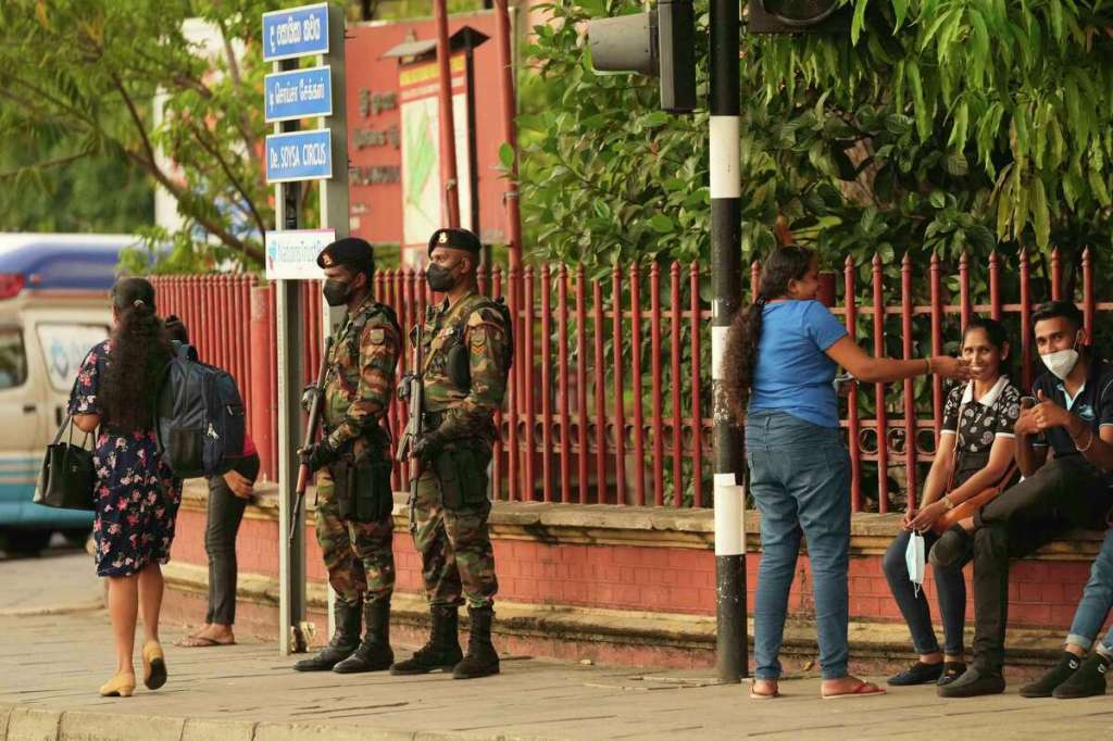 Sri Lankan army soldiers stand guard in Colombo, Sri Lanka, Saturday, April 2, 2022. Sri Lanka imposed a countrywide curfew starting Saturday evening until Monday morning, in addition to a state of emergency declared by the president, in an attempt to prevent more unrest after protesters took to the streets blaming the government for the worsening economic crisis.