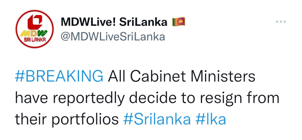 Then on Sunday night in a surprising turn of events Sri Lanka’s cabinet resigned en masse from their positions,