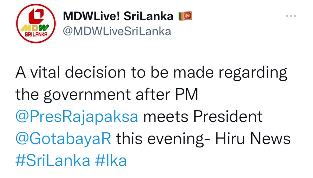 Ruling coalition party urges President Gotabaya to form all-party government Sri Lanka’s former president Maithripala Sirisena’s Freedom Party has called on President Gotabaya Rajapaksa to form an all-party government to tide over the worst economic crisis.