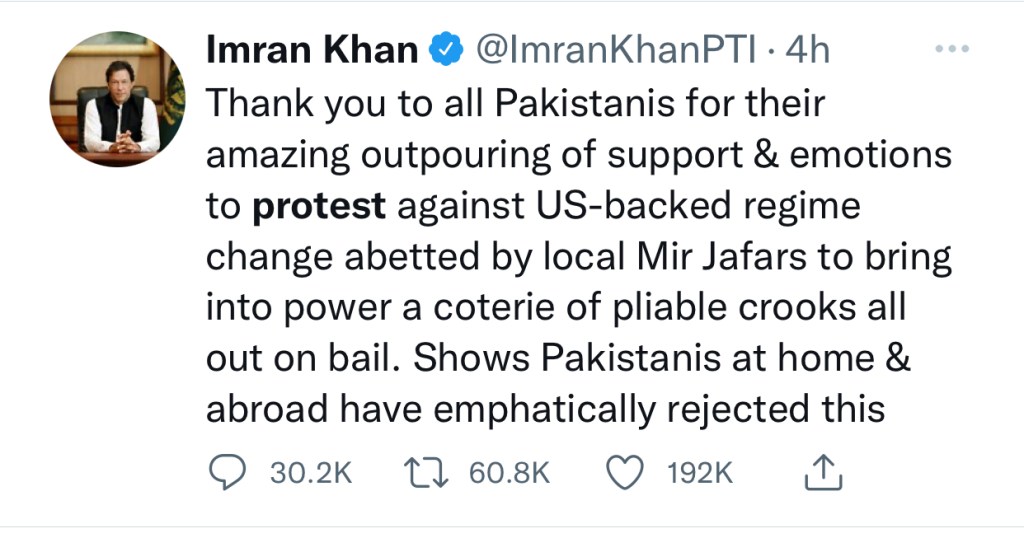 “Thank you to all Pakistanis for their amazing outpouring of support and emotions to protest against US-backed regime change abetted by local Mir Jafars to bring into power a coterie of pliable crooks all out on bail. Shows Pakistanis at home & abroad have emphatically rejected this,” Imran Khan tweeted.