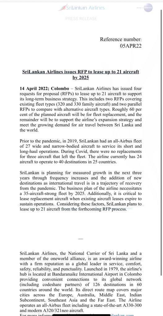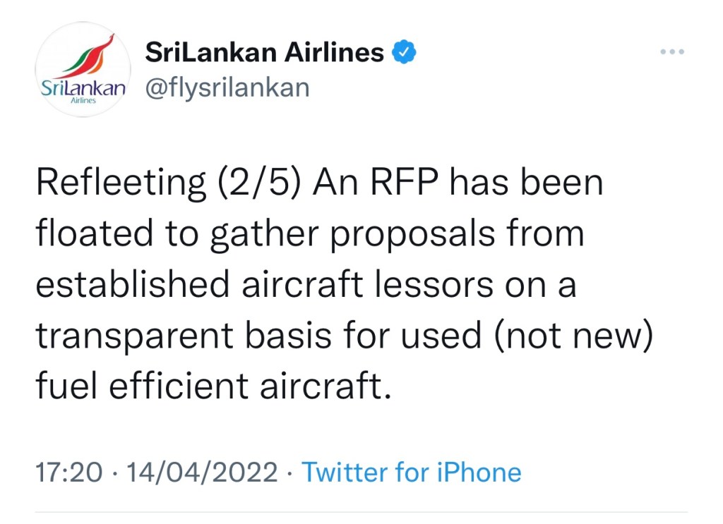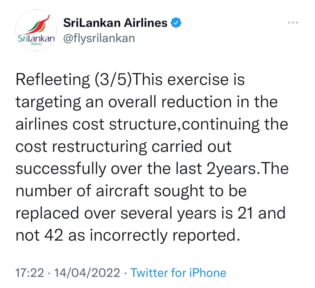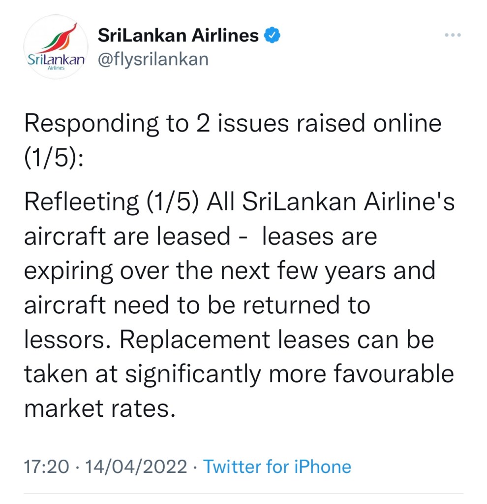 Read Earlier update: Loss making SriLankan Airlines to lease up to 21 aircraft to expand fleet, slammed by opposition
