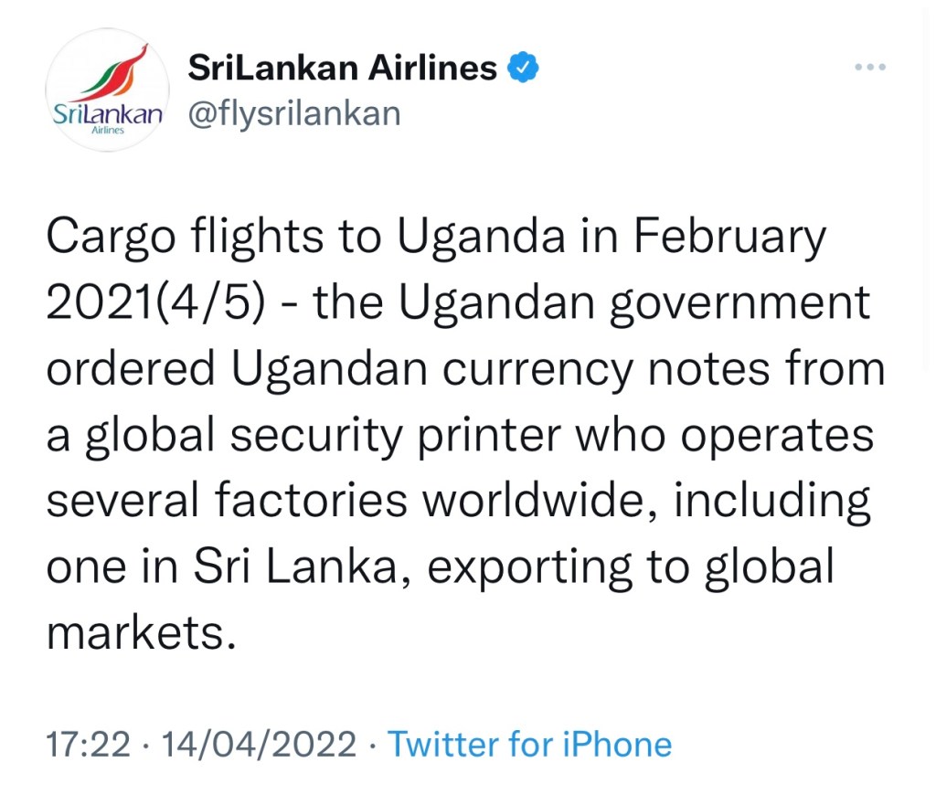 SriLankan Airlines also provided clarification with respect to speculation circulating on social media with respect to SriLankan Aircraft uplifting printed material to Entebbe International Airport in Uganda last year: