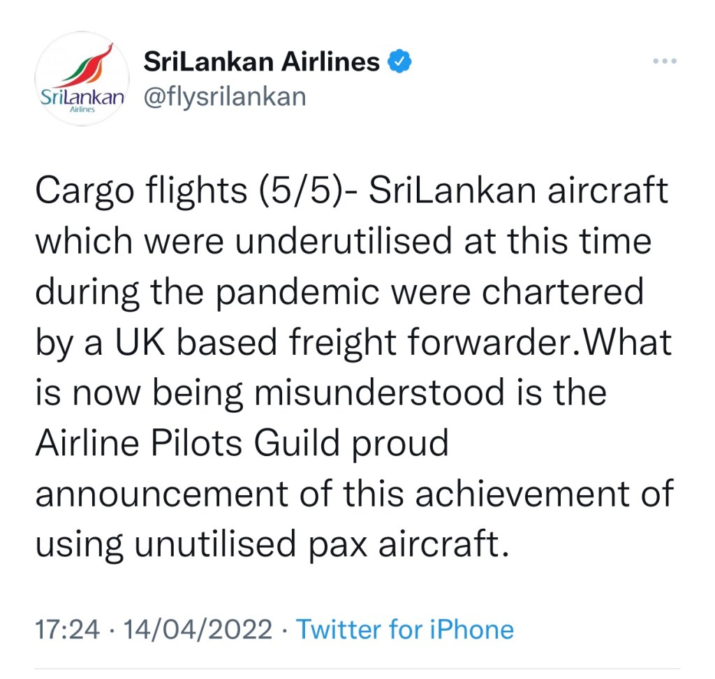 SriLankan Airlines received an air cargo order to transport about 102 tons of printed material from Colombo to Entebbe International Airport in Uganda in February 2021. The consignment was purely commercial in nature and brought in much needed foreign revenue to the airline and country at the time. SriLankan wishes to emphasize that this cargo order was undertaken for commercial reasons only.