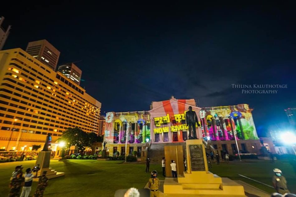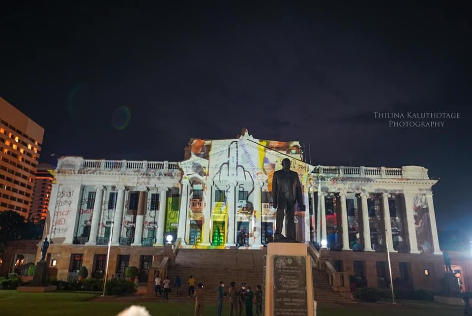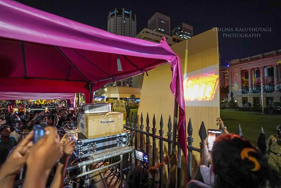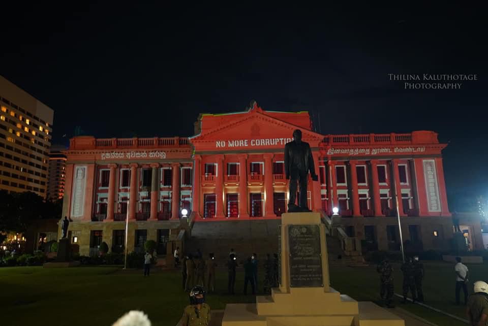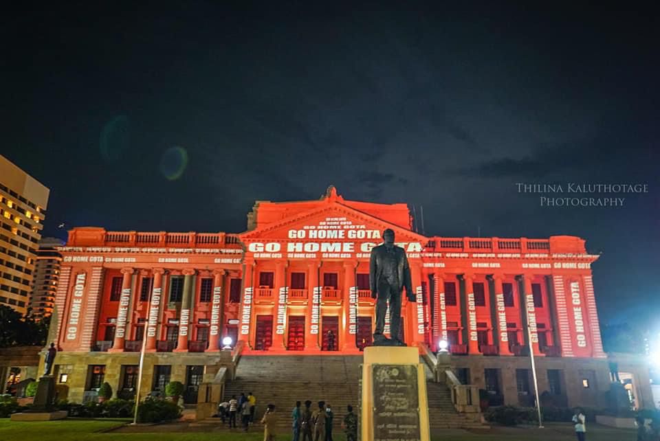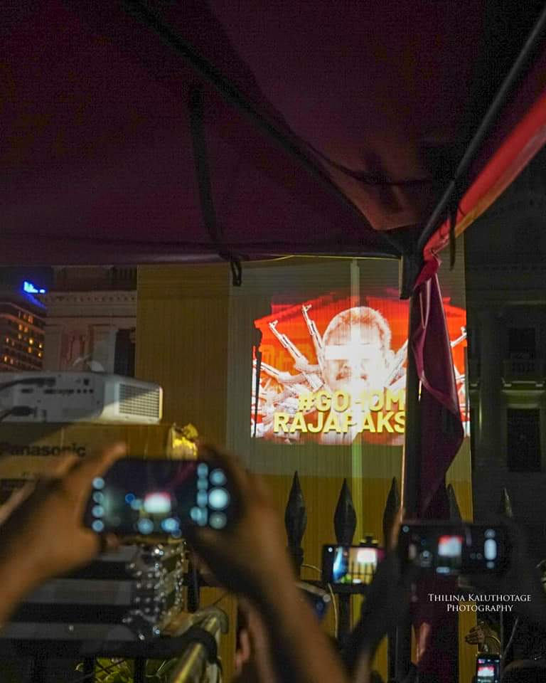 Protestors in Sri Lanka turn to latest technology and lit up the Presidential Secretariat building with ‘Go Home Gota’ slogans. Here are some of latest sights from Galle face.
