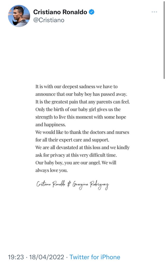 In December they announced they were expecting a boy and a girl.Ronaldo wrote Monday on Twitter, “Only the birth of our baby girl gives us the strength to live this moment with some hope and happiness. We would like to thank the doctors and nurses for all their expert care and support. We are all devastated at this loss and we kindly ask for privacy at this very difficult time.