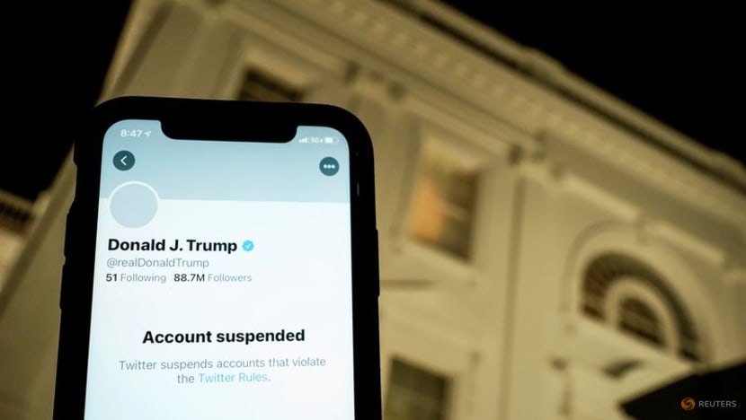 FILE PHOTO: A photo illustration shows the suspended Twitter account of U.S. President Donald Trump on a smartphone and a lit window in the White House residence in Washington, U.S., January 8, 2021. REUTERS/Joshua Roberts/Illustration/File Photo